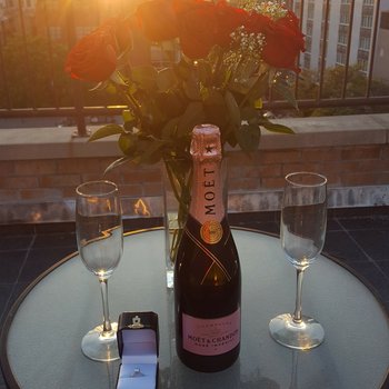 After a day that tested him to his limits (ask him about it!) Ryan proposed on our rooftop on June 1 with a video slideshow of our adventures, a bottle of champagne we had been saving for a special occasion, a dozen roses, a beautiful sunset and a stunning ring.